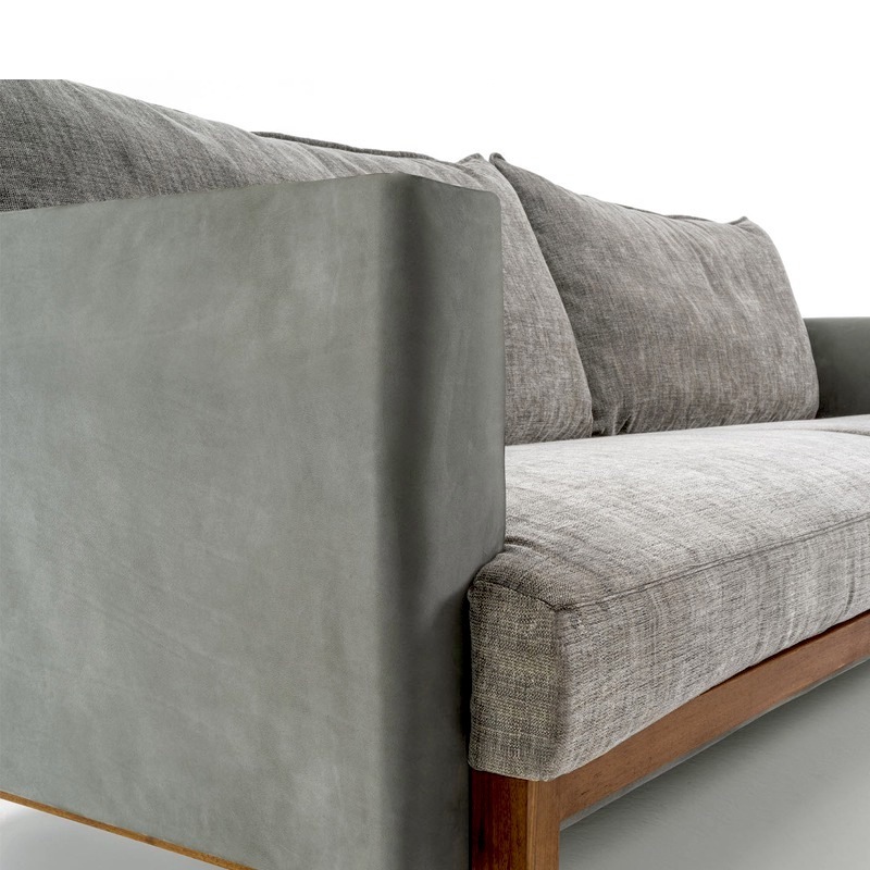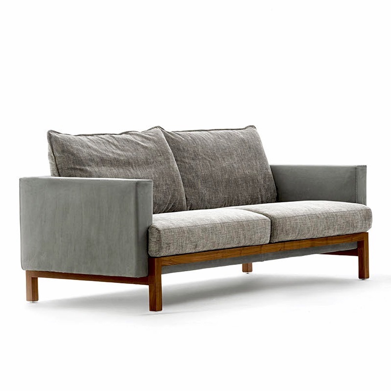 Sofa mit einem Rahmengestell aus Massivholz in drei Größen. Die in vielfältigen Ausführungen zur Verfügung stehenden Stoff- und Leder-Bezüge von Arm- und Rückenlehnen sind individuell mit denen der Sitz- und Rückenpolster kombinierbar.