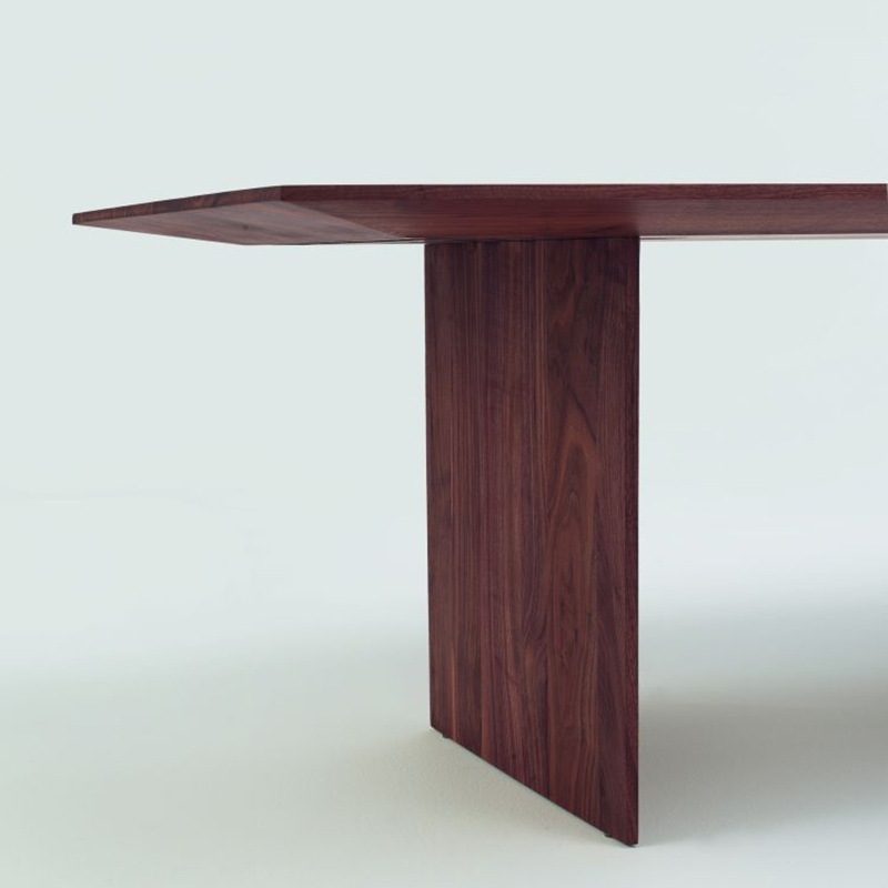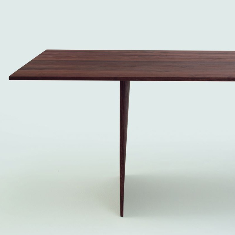 Esstisch aus verleimten Massivholz-Leisten, mit rechteckigen Kanten. Die besondere Bearbeitung der Tischbeine lassen den Tisch außergewöhnlich leicht erscheinen.