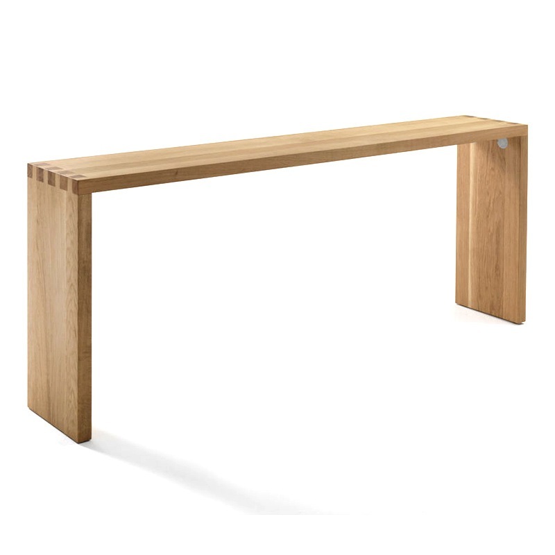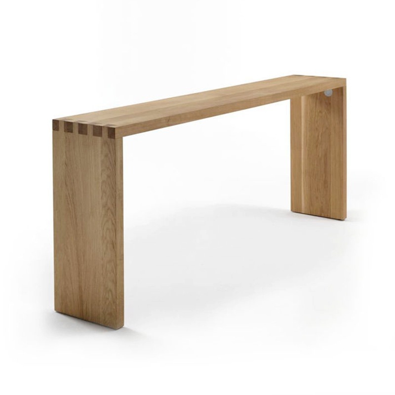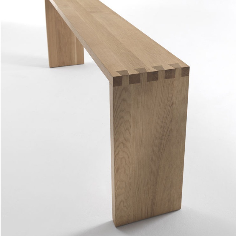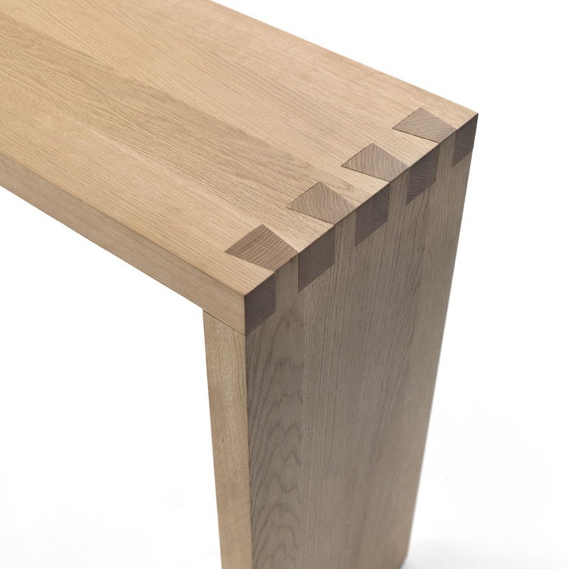 Konsoltisch aus Massivholz aus verleimten Leisten. Die Besonderheit dieses Tisches ist die Schwalbenschwanzverbindung zwischen der Platte und den Seitenteilen.