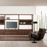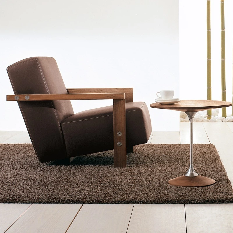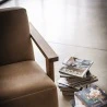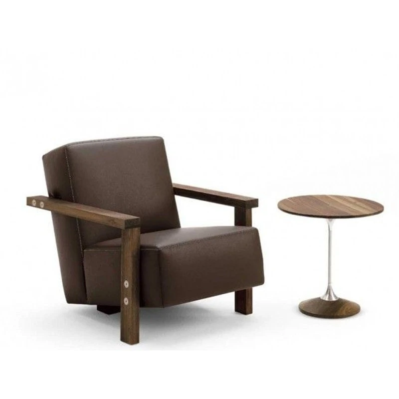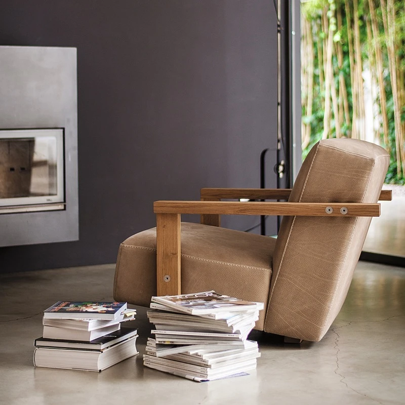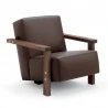 Armlehn-Sessel mit Gestell aus Massivholz, ausgestattet mit bequemer gepolsterter Rücken- und Sitzfläche mit Überzug aus Leder oder Stoff mit sichtbaren Nähten.