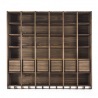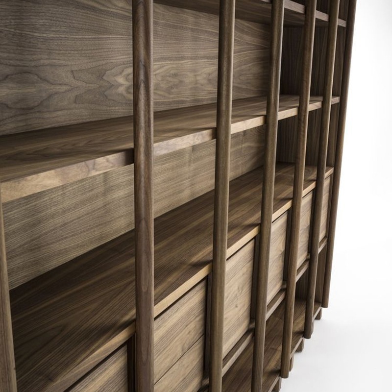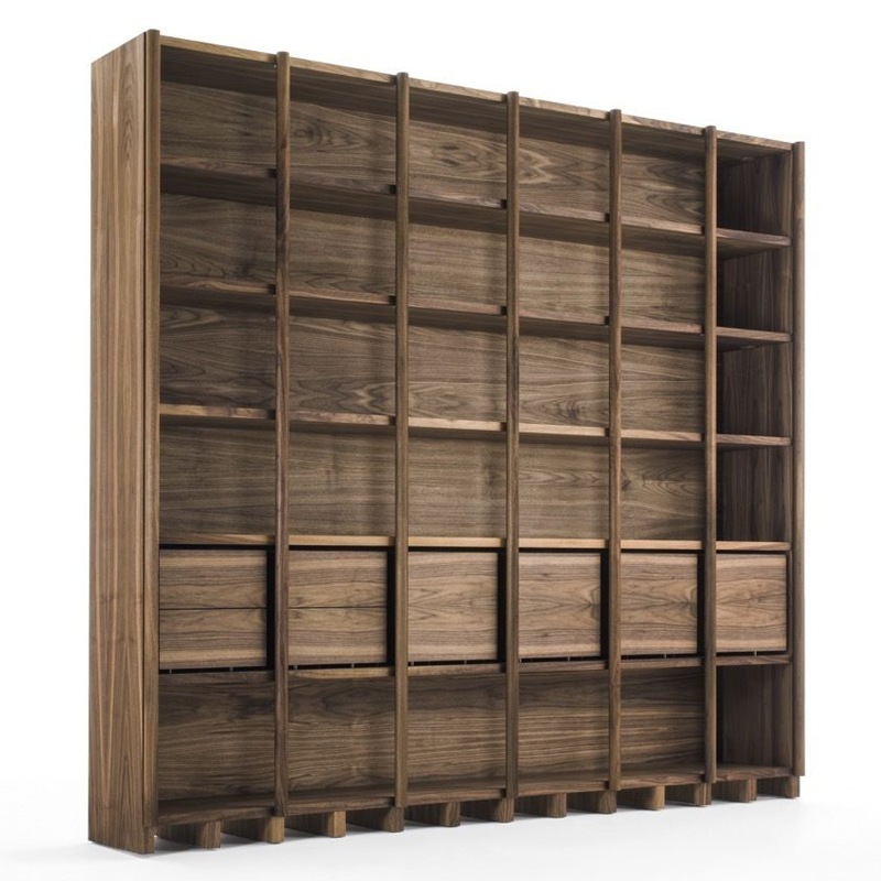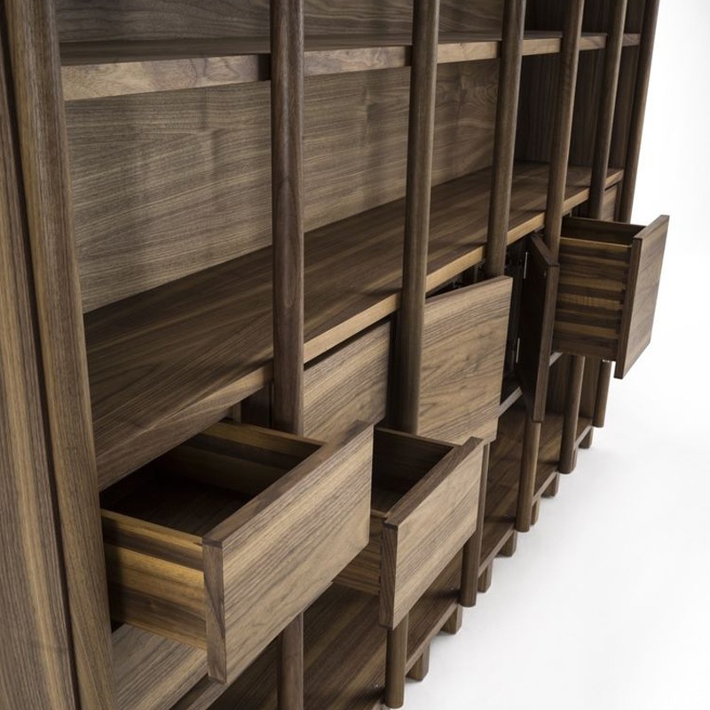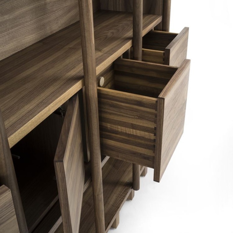 Vielfältig konfigurierbares Regal-System aus Massiv- und Furnierschichtholz in verschiedenen Ausführungsvarianten. In der dargestellten Konfiguration inkl. Doppeltüren sowie Vollauszug-Schubladen mit Schwalbenschwanzverbindungen und Push-Pull-Schließsystem.