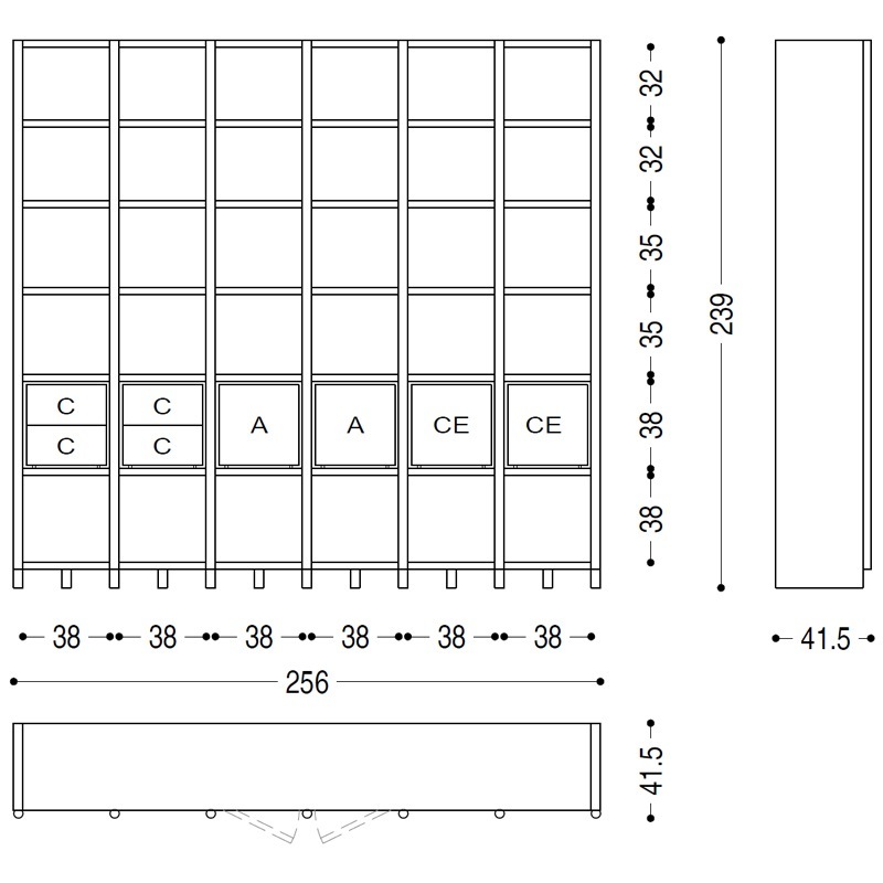 Abmessungen (abgebildete Konfiguration): Breite 256, Tiefe 42 cm, Höhe 239 cm