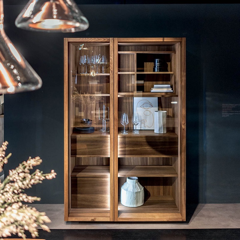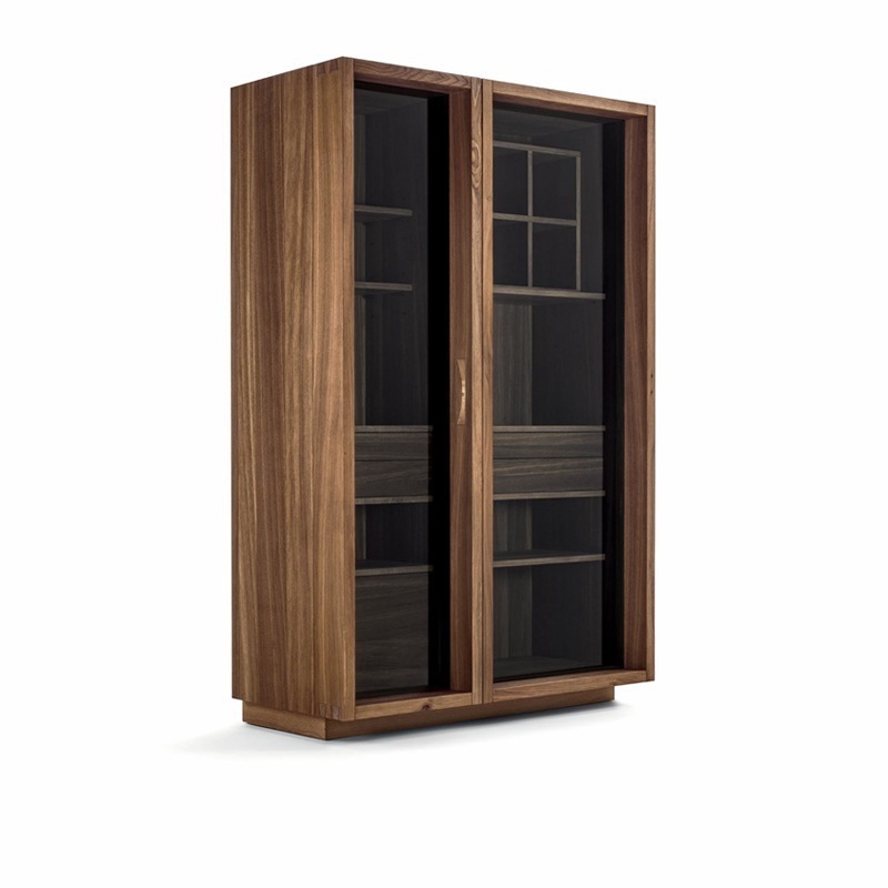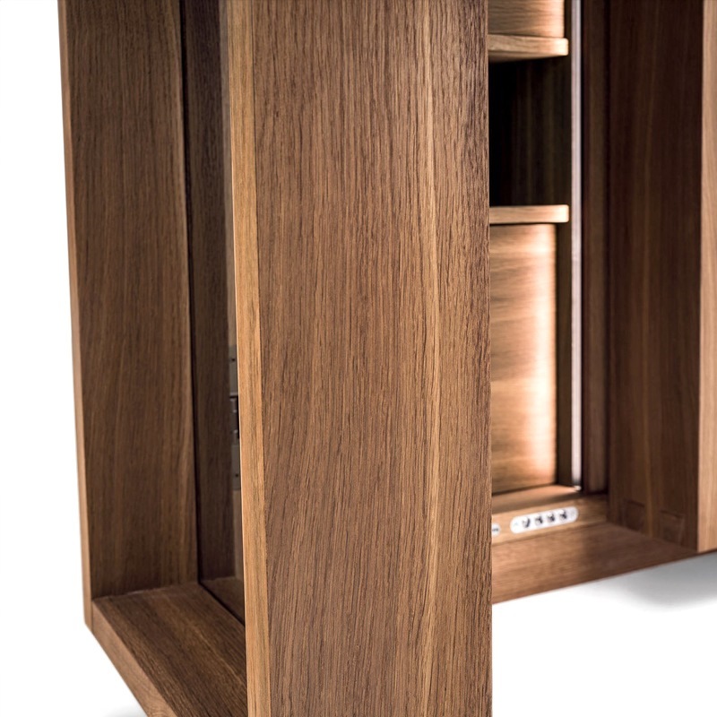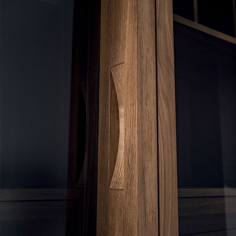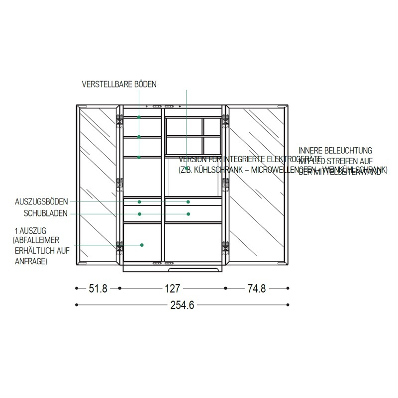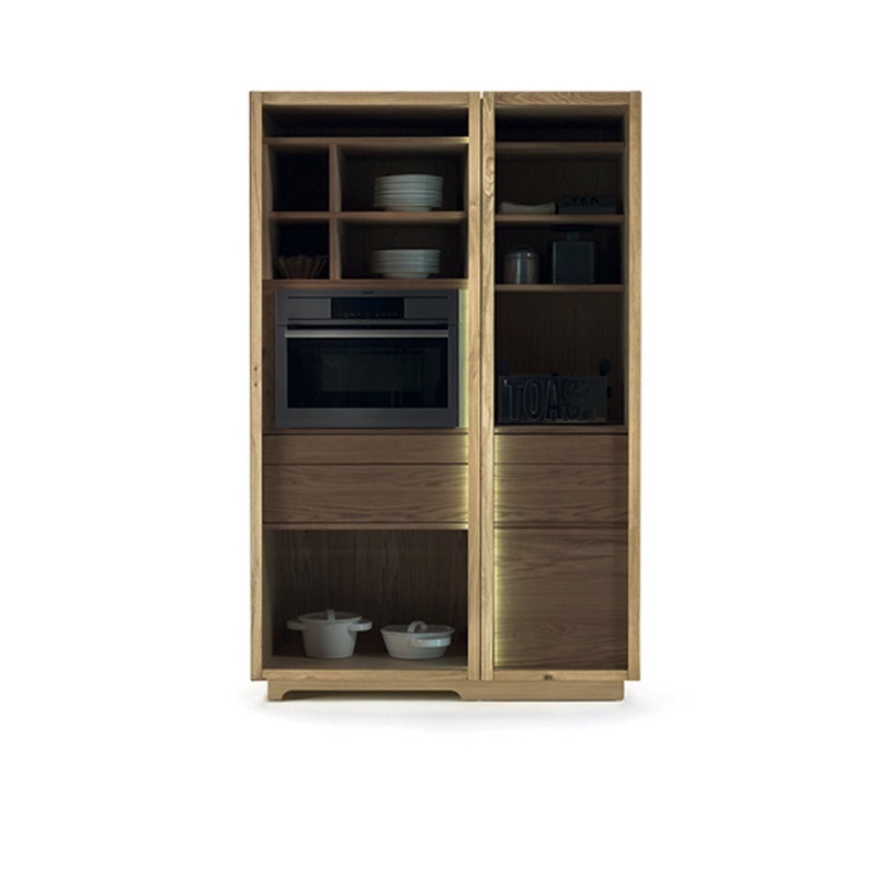 Küchen-Mehrzweckschrank aus Massiv- und Furnierschichtholz mit zwei unterschiedlich großen Hozrahmen-Glastüren mit einem Öffnungswinkel von bis zu 180° Grad. Ausgestattet mit Fächern, Ablagen, Auszugböden und Vollauszugschubladen mit PushPull-Schließe, bietet die tiefere Jumbo-Vatiante zusätzlich die Option, beispielsweise Elektrogeräte wie Mikrowelle oder Kühlmodul zu integrieren. Die Innenbeleuchtung erfolgt durch Sensor-geschaltete LED-Lichtleisten. Optional ist dieser Schrank auch in einer Ausführung mit zusätzlichem Holz- oder Metall-Außenrahmen verfügbar.