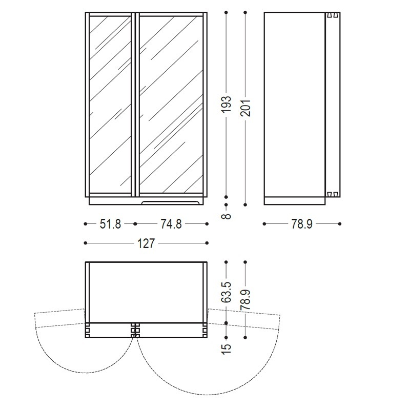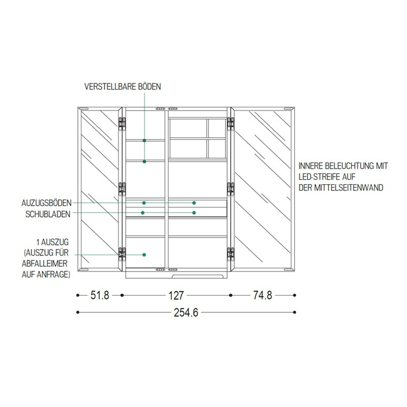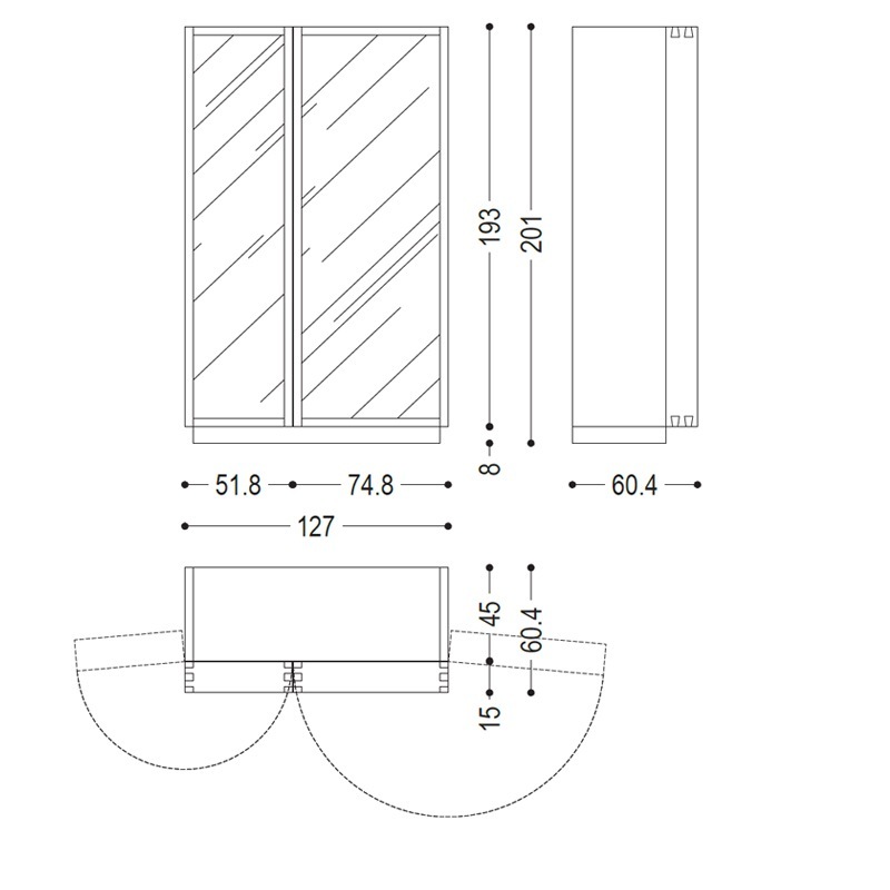 Abmessungen: Breite 127/255 cm | Tiefe 60.5 oder 79 cm | Höhe 201 cm