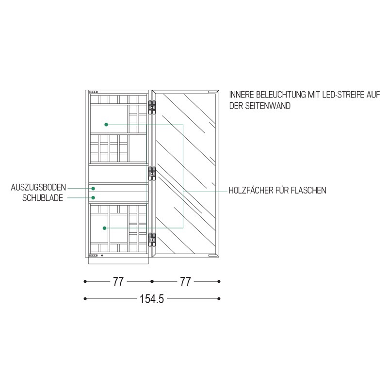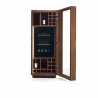 Wein- oder Mehrzweckschrank aus Massiv- und Furnierschichtholz mit Hozrahmen-Glastür, die in einem Winkel von bis zu 180° Grad geöffnet werden kann. Ausgestattet mit Ablage- und Flaschenfächern, Gläserhaltern, Schublade und Auszugboden, bietet die tiefere Jumbo-Vatiante zusätzlich die Option, beispielsweise ein Mikrowellen- oder Kühlmodul zu integrieren. Die Innenbeleuchtung erfolgt durch eine Sensor-geschaltete LED-Lichtleiste. Optional ist dieser Schrank auch in einer Ausführung mit zusätzlichem Holz- oder Metall-Außenrahmen verfügbar.