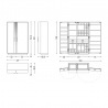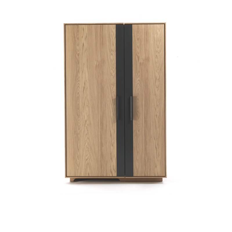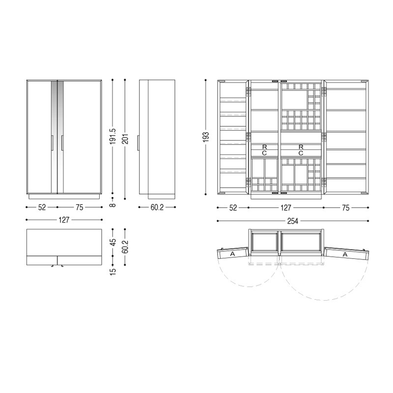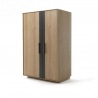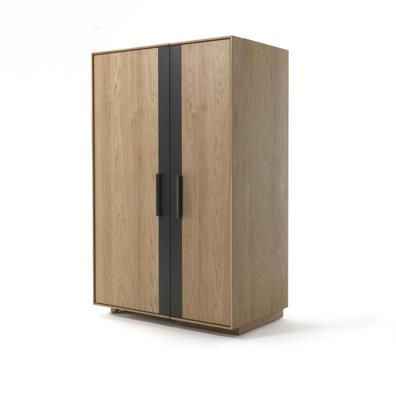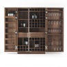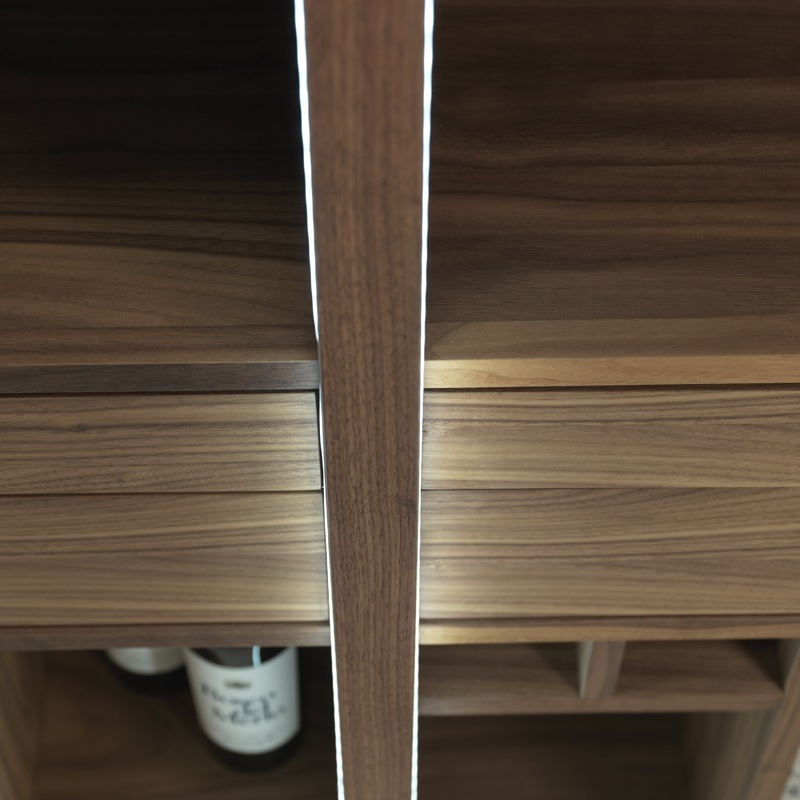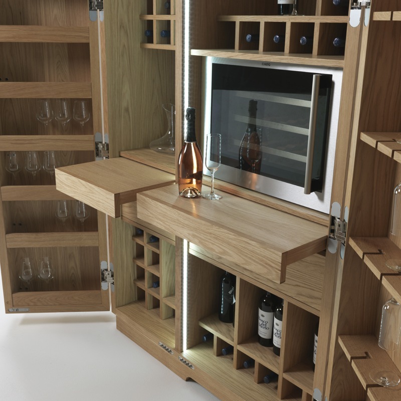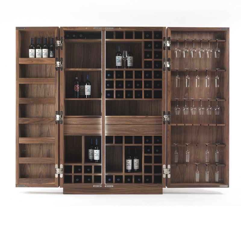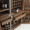 Weinschrank aus Massiv- und Furnierschichtholz mit zwei um 180° Grad drehbaren Türen. Die Innenausstattung des Schranks umfasst nebst 56 Flaschenfächern, auch 10 weitere mit verstellbaren Einlegeböden sowie je zwei mit PushPull-Schließen versehene Auszugböden und Schubladen. Die Innenseiten der Türen sind vornehmlich für die Aufnahme von Gläsern ausgelegt. Der mit automatisch einschaltenden LED-Lichtleisten ausgestattete Mittelbereich des Schranks bietet zudem die Möglichkeit, kleinere Elektrogeräte wie beispielsweise Kühlschrank oder Weinkühler zu integrieren. Die beiden unabhängig voneinander zu öffnenden Türen verfügen über massive, auf einer vertikalen Metallblende angebrachte Griffe, die in der Standardversion aus anthrazitfarben lackiertem Eisen (Irondust) gefertigt sind.